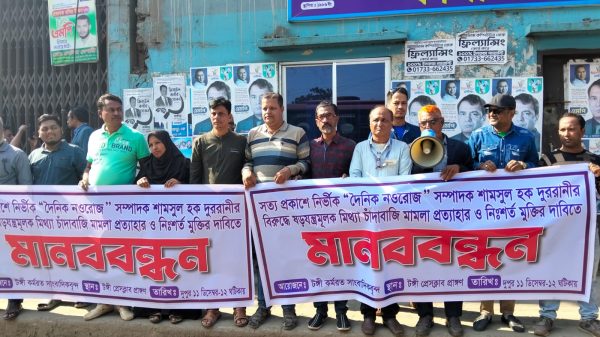 দৈনিক নওরোজ” পত্রিকার সম্পাদক শামসুল হক দুররানীর বিরুদ্ধে দায়ের হওয়া তথাকথিত ষড়যন্ত্রমূলক ও মিথ্যা চাঁদাবাজি মামলা প্রত্যাহার এবং তাঁর নিঃশর্ত মুক্তির দাবিতে টঙ্গীতে মানববন্ধন অনুষ্ঠিত হয়েছে।বৃহস্পতিবার দুপুর ১২টায় টঙ্গী প্রেসক্লাবের
