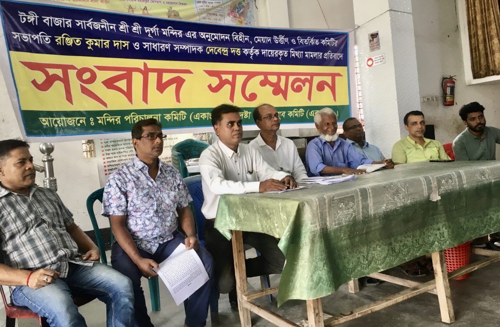 সংবাদ সম্মেলনে জানানো হয়, ১৯৮৩ সালে টঙ্গী বাজারে অবস্থানরত সনাতন সম্প্রদায়ের বেশকিছু লোকজন মিলিত হয়ে সনাতন সম্প্রদায়ের কল্যাণে কাজ করার উদ্দেশ্যে শ্রীনাথ দাসকে সভাপতি এবং কবিরাজ মদন মোহনকে সাধারণ সম্পাদক করে হিন্দু জনকল্যাণ সমিতি গঠন করা হয়। পরবর্তীতে উক্ত সংগঠনের মাধ্যমে সনাতন সম্প্রদায়ের পূজাচর্না করার জন্য ১৯৯৪ সালে নদীর পাড়ে মন্দিরটি প্রতিষ্টিত করা হয়। তারপর থেকে মন্দিরটিতে নিয়মিত পূজাচর্ণা পরিচালনায় হয়ে আসছে। সবশেষ ২০১০ সালে রঞ্জিত দাসকে সভাপতি এবং শ্যামল পালকে সাধারন সম্পাদক করে ৫১ সদস্য বিশিষ্ট একটি পূর্ণাঙ্গ মন্দির পরিচালনা কমিটি গঠন করা হলে ওই কমিটি মন্দিরে সকল প্রকার পূজাচর্ণা করতে থাকে। সর্বশেষ ৪ আগষ্ট ২০১৭ সালে রঞ্জিত দাসকে সভাপতি এবং দেবেন্দ্র দত্তকে সাধারণ সম্পাদক করে ৫১ সদস্য বিশিষ্ট মন্দির পরিচালনা কমিটি, ২১ সদস্য বিশিষ্ট উপদেষ্টা কমিটি, ২১ সদস্য বিশিষ্ট যুব কমিটি গঠন করা হয়। সে সময় মন্দির নির্মাণ কমিটি করার প্রস্তাব আসলেও সভাপতি ও সাধারণ সম্পাদক রহস্যজনক কারণে সেই কমিটি গঠন না করে মন্দিরের নির্মাণ কাজ শুরু করেন। পরবর্তীতে ৪ আগষ্ট ২০২০ সালে উপরোক্ত কমিটিগুলোর মেয়াদ শেষ হলে উপরোক্ত দুই ব্যক্তি নতুন কমিটি প্রণয়ন এবং গঠনতন্ত্র বাস্তবায়ন না করে এমনকি নিয়মিত সাধারণ সভা না করেই নিজেদের ইচ্ছে মতো কমিটি করার অপ-প্রয়াস করেন। এনিয়ে মতবিরোধ এবং দুটি গ্রুপের সৃষ্টিসহ মন্দিরের শৃংখলা ভঙ্গ হয়। এক পর্যায়ে উভয় পক্ষ স্থানীয় রাজনৈতিক নেতৃবৃন্দ ও জেলা পূজা উদযাপন পরিষদের দ্বারস্থ হলে তারা বিষয়টি সমাধানের চেষ্টা করেও ব্যর্থ হন। কারণ : রঞ্জিত দাস ও দেবেন্দ্র দত্তগং “বিচার মানি কিন্তু তালগাছ আমাদের” নীতিতে বহাল থাকেন এবং এক তরফা নিয়মনীতি উপেক্ষা করে, মন্দির পরিচালনা করতে থাকেন। পরে পূজা উদযাপন পরিষদ ও রাজনৈতিক নেতৃবৃন্দ বিষয়টি প্রশাসনের হাতে ন্যাস্ত করেন। এক পর্যায়ে প্রশাসনের উদ্ধর্তন কর্মকর্তাদের নিদের্শে টঙ্গী পূর্ব থানার অফিসার্স ইনচার্জ গত ১৯ ডিসেম্বর ২০২২ ইং উভয় পক্ষকে শৃংখলা বজায় রেখে এবং উভয় পক্ষের লোকজনের সম্মতিক্রমে গঠনতন্ত্র প্রণনয় এবং ৫ সদস্য বিশিষ্ট আহবায়ক কমিটি গঠন করেন। কিন্তু রঞ্জিত দাস এবং দেবেন্দ্র দত্ত স্থানীয় রাজনৈতিক নেতৃবৃন্দ, স্থানীয় আইনশৃংখলা বাহিনীর কর্মকর্তাদের বৃদ্ধাঙ্গুলী প্রদর্শন করেন এবং উপরন্ত থানার অফিসার্স ইনচার্জকে মিথ্যা দোষারুপ এবং হরি সাধন পোদ্দার, দিপংকর ঘোষ, মহাদেব সাহা, অমল ঘোষ, সুভাষ সরকার, দুলাল দাস, ইন্দ্রজিত সাহা, রতন সরকার, নিতাই দাস, বিপুল দেবনাথকে অভিযুক্ত করে ষড়যন্ত্রমূলক মন্দিরের উপদেষ্টা কমিটি, মন্দির পরিচালনা কমিটি ও যুব কম